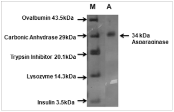 | Figure 6: Determination of molecular weight of L-asparaginase by sodium dodecyl sulphate-polyacrylamide gel electrophoresis (M: Molecular weight markers; A: L-asparaginase). [Click here to view] |