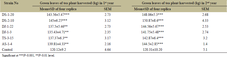 | Table 1: Green leaves of tea plant harvested (in 1st year) after treatment with selected biofertiliser. [Click here to view] |
