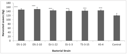 | Figure 6: Graphical presentation of effect of the bacterial strain on the plant height. Significant at *** P<0.001. [Click here to view] |