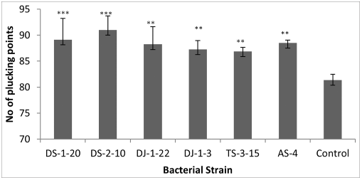 | Figure 5: Graphical presentation of effect of bacterial strain on the growth of plant girth. Significant at *** P<0.001, ** P<0.01 level. [Click here to view] |