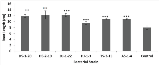 | Figure 7: Graphical presentation of the effect of bacterial strain on the growth of root length. Significant at *** P<0.001. [Click here to view] |