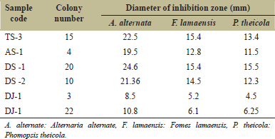 The antagonistic activity among of all the isolated bacterial strain, DS-1-20 exhibit highest (24.6 mm diameter inhibition zone) positive response against A. alternata a plant pathogenic bacteria causes leaf blight of tea plant. TS-3-15 and DS-1-20 showed the highest (15.4 mm diameter inhibition zone) positive response against Fomes lamaensis tea pathogenic (causing brown root rot) fungi. DS-1-20 showed a positive response (15.5 mm diameter inhibition zone) against P. theicola, a tea pathogenic fungi (branch canker) [Figures 9 and 10, Table 4].