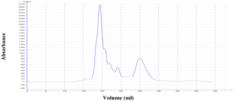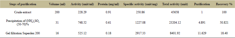 The process of gel filtration was done by using ÄKTA Pure 25 apparatus with Superdex 200 10/300 GL column (10 mm diameter, column size 23.562 ml, pressure 1.5 mpa, dimensions 10 × 300 mm, flow rate of 0.5 ml/min) filled packaged with agarose and dextran, the column was calibrated with acetate buffer pH 5 (4 liters), then injecting the concentrated sample (0.5 ml) which was obtained from the precipitation of ammonium sulphate in the column gradually after filtered by millipore filter 0.22 μm and following the separated peaks on the wavelength of 280 nm, then measured the enzymatic activity (unit/ml).