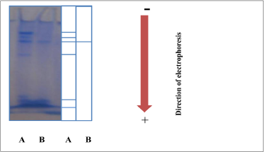 | Figure 2: Determination of tannase purity by electrophoresis in polyacrylamide gel without SDS, A: crude extracted; B: pure enzyme after gel filtration. [Click here to view] |