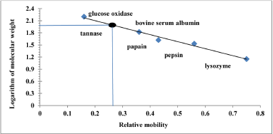Estimate the molecular weight for tannase by SDS-PAGE in the gel of a polyacrylamide using standard proteins as shown in Figure 3, that explains the relationship between logarithm the molecular weight of standard protein and relative movement of the protein itself, which shows that the molecular weight of tannase reached to 95.49 KDa.