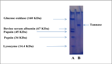 | Figure 4: Electrophoresis with SDS in polyacrylamide gel, A: standard proteins; B: pure tannase. [Click here to view] |