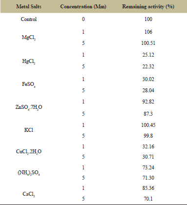 Equal volumes of purified enzyme were mixed with 1 and 5 mM of metal salt (MgCl2, HgCl2, FeSO4, ZnSO4.7H2O, KCl, CuCl2.2H2O, (NH4) 2SO4, CaCl2) then incubated at 30°C for 60 min after that enzyme activity was assayed and remaining activity was calculated.