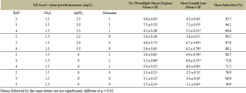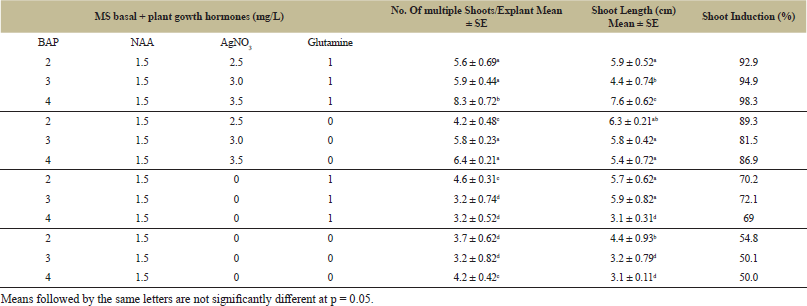 | Table 2: Effects of various media composition on in vitro regeneration, multiple shoot induction and shoot length on shoot tip explants of Lota Bhot. [Click here to view] |
