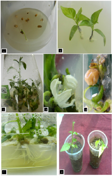 | Figure 1: In vitro propagation of C. chinense variety Lota Bhot (a) Seed explant (b) Shoot tip explant (c) Multiple shoot induction (d) Flower Induction (e) Fruit Formation (f) Root induction (e) Ex vitro acclimatization (Soil + vermicompost in 1:1 ratio). [Click here to view] |