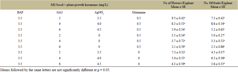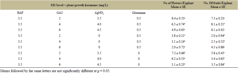For induction of flower under in vitro condition, healthy shoot buds were selected from six-week-old cultures and shifted to flower induction medium containing MS supplemented with BAP (3.5 mg/L), GA3 (2-6 mg/L), glutamine (0.5 mg/L) and enriched with/without AgNO3 (3.5-4.5 mg/L). In vitro flowering was observed after 35 days of inoculation. Terminal shoots with in vitro flowers were carefully transferred to fruit induction medium which consists of MS fortified with AgNO3 (3.5-4.5 mg/L) and with/without glutamine. All cultures were subjected to a 16/8 h light/dark cycle for fruit development.