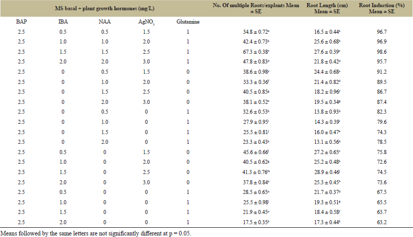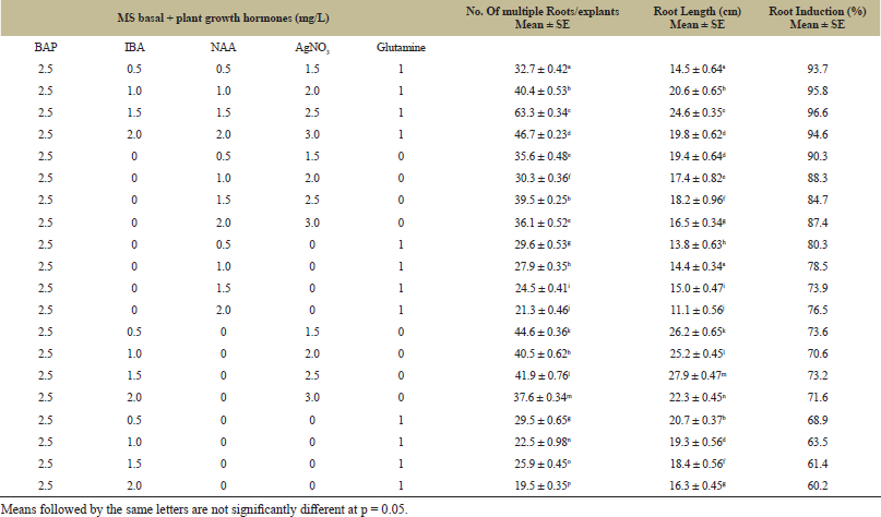 | Table 5: Effects of various media composition on the percentage of regenerated roots, in vitro root induction and root length of seed explants of Lota Bhot. [Click here to view] |