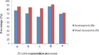 ![]() | Figure 2: Response of explants (seed and shoot tip) of Lota Bhot towards various in vitro processes. (a) Shoot induction (b) flower induction, (c) fruit induction (d) root induction (e) acclimatization. [Click here to view] |