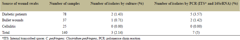 A total of 140 clinical samples were collected during this study, 3 (2.14%) C. perfringens isolates were recovered, of which 2 isolates (1.43%) were obtained from diabetic patients, and 1 isolate (0.71%) was obtained from bullet wounds. No isolates were recovered from the other clinical samples (cellulitis) [Table 1]. The majority of C. perfringens isolates were detected in diabetic patients and bullet wounds in 1.43% and 0.71%, respectively.