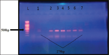 | Figure 1: 1.5% agarose gel electrophoresis at 70 volt for 50 min for Clostridium perfringens 16SrRNA polymerase chain reaction products visualized under ultraviolet light at 280 nm after staining with ethidium bromide. L: 1500 bp ladder; lane (1, 2, 3, 4, 5, 6, and 7) are positive. The amplicon size is 279 bp [Click here to view] |