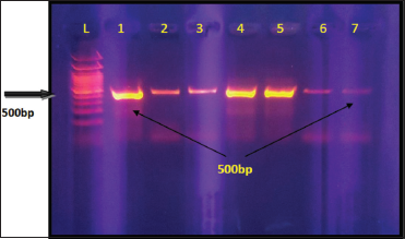 | Figure 2: 1.5% agarose gel electrophoresis at 70 volt for 50 min for Clostridium perfringens 16S-23S spacer rRNA polymerase chain reaction products visualized under ultraviolet light at 280 nm after staining with ethidium bromide. L: 1500 bp ladder; lane (1, 2, 3, 4, 5, 6, and 7) are positive. The amplicon size is 500 bp [Click here to view] |