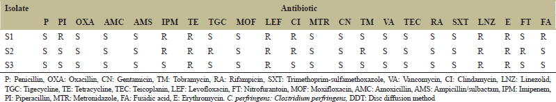 Results of susceptibility testing using Vitek 2 system and DDT of C. perfringens isolates (no = 3) against 24 antibiotics showed that all isolates were highly susceptible to penicillins (such as benzylpenicillin, piperacillin, and amoxicillin), and they were sensitive to β-lactam-β-lactamase inhibitor combinations, such as ampicillin-sulbactam [Table 2]. They were also susceptible to metronidazole and aminoglycosides in 3/3. Furthermore, all isolates were highly resistant to tetracycline, levofloxacin, and erythromycin. However, these isolates expressed different degrees of susceptibility toward other antibiotics (linezolid, clindamycin, and imipenem) [Table 2].