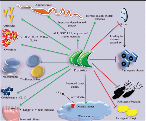![]() | Figure 1: Overall beneficial effects of probiotic in Aquaculture. Green arrow indicates additive effects. Red lines indicate inhibitory effect [Click here to view] |