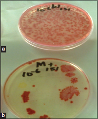 ![]() | Figure 1: Colonies of GBB151 wild type and mutants on nutrient agar. (a) GBB151 wild-type colonies, (b) GBB151 mutant strains colonies [Click here to view] |