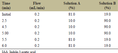 | Table 1: Chromatographic gradient conditions for the analysis of IAA [Click here to view] |