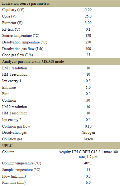 | Table 2: UPLC/ESI-MS/MS conditions used in the study [Click here to view] |