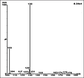 After the ionization was performed, fragmentation of the IAA standard was produced by collision of the analyte with argon gas. The most abundant ion fragment showed a mass/charge ratio (m/z) of 130, which is in accordance with a study stating that a product ion at m/z 130 with a molecular formula of C9H8N and measured mass (monoisotopic) of 130.0674 Da could be observed in the MS/MS mode of IAA due to an electronic conjugation effect between the carbanion and the indole ring [(M+H-HCOOH)+] [17]. Figure 3 shows the the spectrum of fragmentation of the IAA standard obtained by collision with argon gas and electrospray ionization in positive mode (ESI+) using the triple quadrupole mass spectrometer equipment.