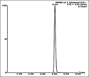 For quantitative purposes, we used the multiple reaction monitoring (MRM) mode using the fragment ion m/z 130 of the precursor ion m/z 176 [18-21]. The MRM transitions for detection of the compound were chosen from experiment product ions in the mass spectrometer, selected for the channels of MRM ion greater abundance, as shown in Figure 4.