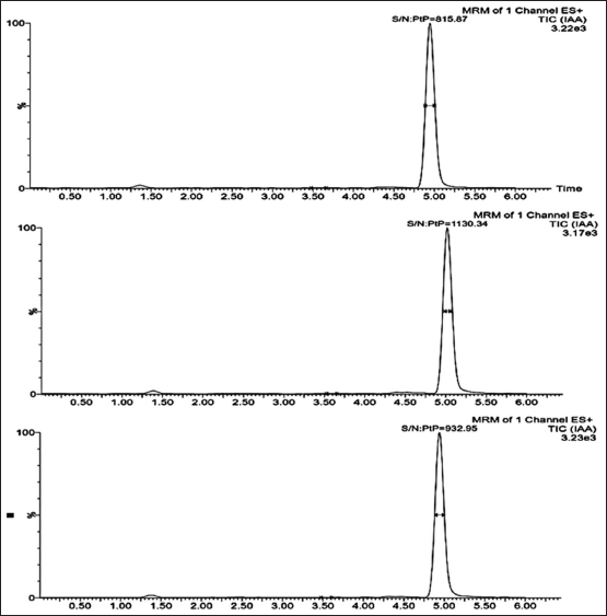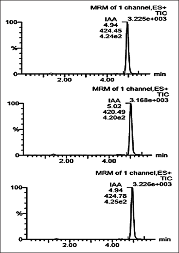 ![]() | Figure 4: Spectrum of the indole-3-acetic acid standard in multiple reaction monitoring (MRM) mode [Click here to view] |