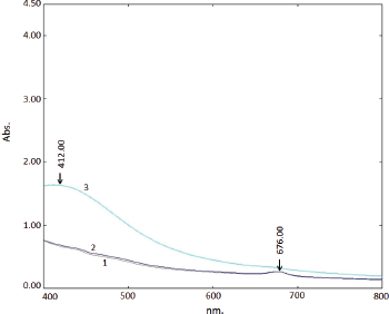 The UV-Visible study over green synthesis of AgNPs based on optimization of temperature (8°C–10°C, room temperature, and 60°C) generated a UV-Visible spectrum given in Figure 6, containing three curves 1, 2, and 3. The UV-Visible spectrum given in Figure 6 displayed no absorption signals for AgNPs in curves 1 and 2 (related to 8°C–10°C and room temperature). Figure 6 displayed an absorption signal for AgNPs in curve 3 (related to 60°C) at 412 nm revealing the completion of green synthesis of AgNPs. Resultant data of temperature optimization in present study expressed as absorbance signal were in agreement with the data of other investigations [41,43,45,46].