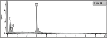 To understand the presence of elements contained by AgNPs, the EDX analysis was carried out [50]. The EDX spectrum for AgNPs is given in Figure 13. The resultant data of EDX analysis was found to be comparable with other research also [50,53]. The EDX spectrum showed strong signal in the silver region and confirmed the formation of AgNPs. The spectrum (Fig. 13) revealed silver (84.63%) as a major constituent element compared to carbon (11.48%), oxygen (2.36%), and nitrogen (1.53%). Generally, AgNPs displays typical optical absorption peak at 3 KeV due to SPR [54]. The EDX spectrum exhibited strong signal for silver, which may be attributed to presence of biochemical moieties that bound on silver surface, resulting in reduction of silver ions to elemental silver. This establishes the ecofriendly reduction of silver compound into AgNPs [55].