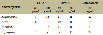 ![]() | Table 1: Antimicrobial activity of EFLAE and AgNPs (Zone of inhibition expressed in mm). [Click here to view] |
