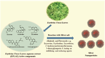 | Figure 14: Schematic diagram representing probable mechanism of AgNPs formation using EFLAE. The EFLAE contains several alkaloids and flavonoids such as erysovine, erythraline, erysothrine, 2’-hydroxyneobavaisoflavanone, 5-deoxyglyasperin F, and other constituents. These phytochemicals may reduce the silver salts and stabilize the AgNPs. This figure is adapted from the research work of Nayan et al. [62]. [Click here to view] |