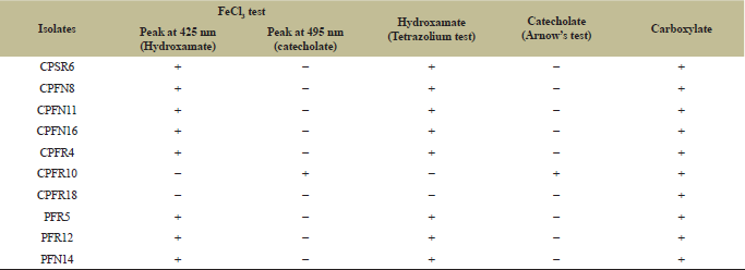 Out of 14, 10 isolates were producing siderophore units above 65% in CAS-liquid assay. Siderophores produced by microorganisms are usually classified as catecholates, hydroxamates, carboxylates, and mixed type. A range of biochemical assays were used for determining siderophore type [23,24,40]. Most of our isolates were positive for hydroxamate type of siderophore. Earlier studies also reported that several soil bacteria could produce more than one type of hydroxamates [6]. The catecholate type of siderophore was detected by Arnow’s test and FeCl3 test. Only one of the isolate CPFR10 produced catecholate type of siderophore.