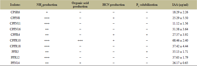 All these 10 siderophore producers were assessed for their plant growth promoting capability. All the isolates were able to produce IAA in the range of 11.12–68.46 µg/ml and ammonia. Only two isolate CPFR4 and PFR5 were able to solubilize phosphate. Isolate CPFR10 possessed multi plant growth promoting (PGP) traits and was found to be best ammonia, organic acid and IAA producer among all (Table 3).