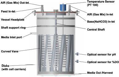 The rigid wall SUB vessel is made of injection molded cell culture grade, biocompatible Polyethylene terephthalate (PET) plastic material. Specially-treated cell carriers are sandwiched uniformly in parallel discs which construct the cell carrier bed. These cell carriers are made up of medical grade non-woven polyester PET microfibers. Magnetically coupled rotations of curved vanes in bioreactors ensure nutritional homogeneity throughout culture vessel geometry and achieves desired mixing time and mass transfer characteristics. Dual integrated aeration systems, i.e., purging gases in culture vessel through head space and through GEX, efficiently support gaseous requirements of the high-density cultures without sparging gases directly in culture medium (Fig. 1).