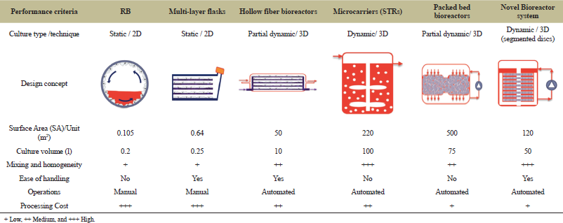 Design concept and its geometrical aspects, surface area available for cell growth per unit, mixing and homogeneity criteria, and other important bioprocessing parameters of currently marketed adherent cell culture technologies ware tabulated and compared with the novel bioreactor system under evaluation study in Table 1 [8].