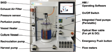 Bioreactor process controller is easy-to-use system with capabilities of monitoring and control of parameters, such as temperature, pH, agitation, aeration, dissolved oxygen concentration (%DO), gas flow rates (air, oxygen, and carbon dioxide), and pump flow rate for media and alkali addition (Fig. 2). Two non-invasive optical sensors for pH and %DO measurement are inserted into the SUB vessel at the time of vessel construction. PT 100 temperature sensor is integrated in SUB for temperature measurement and control. Programmable logic controller based on Proportional, Integral, and derivative (PID) controller maintains temperature of the vessel through heating blanket/silicon heater. The bioreactor system is integrated with perfusion process. The controller system used is equipped with capacitance-based level sensor (to measure and control the level of culture media), peristaltic pumps for perfusion/media inlet, harvest, alkali addition, and media recirculation through GEX.