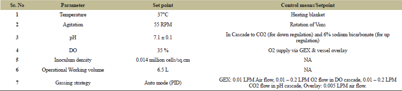 ![]() | Table 2: Bioreactor process parameters. [Click here to view] |