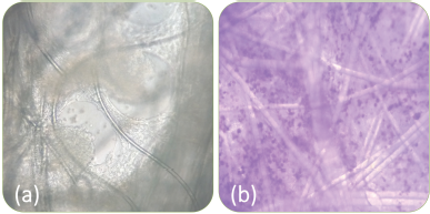 At the end of culture process, cell carrier discs from top, middle, and bottom position were also collected and trypsinized to derive cell counts and %viability. Each individual discs of the support matrix reached 0.41 ± 0.06 million cells/sq.cm, which can be translated to around 78.84billion cells/bioreactor. Images of Vero cells cultured on cell carrier 3D fiber matrix are shown in Figure 7. Figure 7a shows phase contrast microscopy of cell carrier where cells grown in the bioreactor 3D matrix can be seen within the vicinity of carrier fibres. Multi layered three dimensional growth of Vero cells was observed which indicate higher population doublings and cell density per square centimeter of surface area. Figure 7b shows the nuclei of cultured cells stained dark violet using CVD.