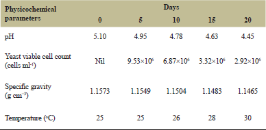 ![]() | Table 1: Physicochemical parameters of papaya wine during regular intervals. [Click here to view] |