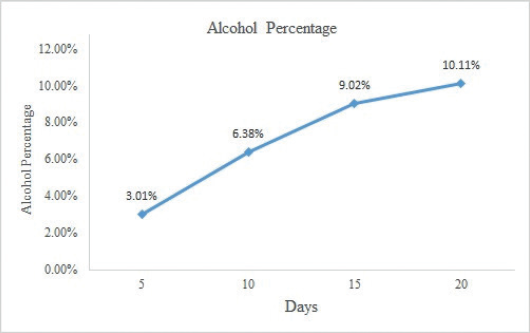 Alcohol content of papaya was found to be increasing during the course of fermentation. It was estimated as 3.01% on the 5th day and increased to 10.11% on the final day (Fig. 2). Initially, the organism grows rapidly utilizing the sugar present in the substrate provided. As the process of fermentation proceeds, the percentage of alcohol increases. This increased alcohol concentration leads to a decline in the number of organisms [18]. The work done showed that papaya can be effectively used for making wine with good characteristics that provide health benefits.