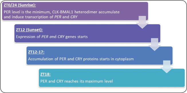 A nearly 24-hour period oscillation in levels of PER mRNA and PER proteins occurs which are expressed rhythmically [31]. There is a rapid transcription of PER gene just after sunset/lights off (zeitgeber time, ZT12), accumulation of PER protein in the cytoplasm 2–6 hours after sunset (ZT10-17) and at ZT18, PER reaches its maximum level. These proteins are translocated to the nucleus 5–8 hours after lights off, where they repress their own transcription. PER protein levels become the lowest during the sunrise/lights on (ZT0/24) [32] (Fig. 1). The delay between PER expression and its repressor activity in the nucleus acts as a checkpoint for a stable circadian oscillation generation [33]. Moreover, a recent study suggests that transcription delay of PER2 and CRY1 and degradation rates of CRY1 and REV-ERBα are the major factors which influence phases of the genes involved in circadian timing network [34].