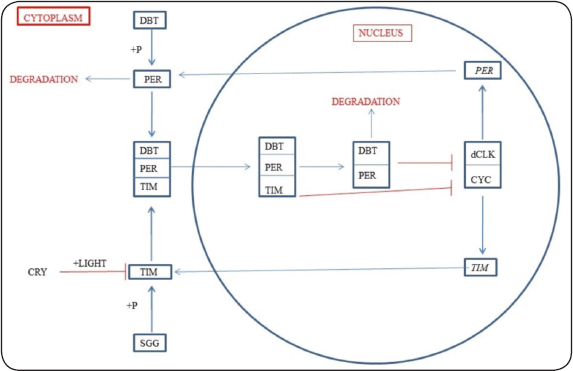 The negative feedback loop involves repression of the positive element dCLK-CYC. This repression is achieved when PER and TIM form a heterodimer due to increase in the amount of PER and TIM proteins. This heterodimer moves into the nucleus and causes a conformational change in dCLK-CYC or decreases its DNA-binding activity without affecting the association between dCLK and CYC which causes fall in the levels of PER and TIM proteins [38]. According to Bae et al. [35], CYC is present in abundant amount, approximately 200 times more than the amount of dCLK. PER and TIM bind with dCLK or dCLK-CYC complex rather than with the free CYC. Thus, dCLK acts as a limiting agent for the PER-TIM and dCLK feedback loops [35]. Figure 2 illustrates that dCLK-CYC heterodimer enhances the transcription of negative elements, PER and TIM genes. The RNA levels of PER and TIM increase, and thus PER and TIM proteins accumulate in the cytoplasm as heterodimer. This heterodimer moves into the nucleus and inhibits dCLK-CYC heterodimer which causes fall in the levels of PER and TIM proteins. DBT is a kinase which degrades monomeric PER but does not show its activity on PER-TIM heterodimer. Shaggy, another protein kinase, is constitutively expressed. It phosphorylates TIM protein and also helps in nuclear translocation of PER/TIM.