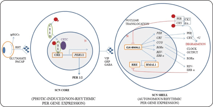 It involves the repression of the positive element CLK-BMAL1 by the negative regulators. As the amount of PER and CRY proteins increases, these proteins stabilize by forming heterodimer involving PAS domain. The heterodimer may be between any one of the three PER proteins with one of the two cryptochrome proteins (CRY1 and CRY2). PER2 has a stabilization sequence that stabilizes the complex. As PER-CRY heterodimer moves into the nucleus, CRY proteins repress the transcription of PER and CRY and also that of REV-ERBα by inhibiting the positive regulators of the loop. As a result, the levels of PER and CRY fall and those of BMAL1 rise during night [55]. Recently, it is shown in mouse liver cell extracts that the three PER proteins form a mature cytoplasmic multi-globular complex with the two CRYs and casein kinase 1 delta which migrates to the nucleus and inhibits CLOCK/BMAL1 [59]. Figure 3 illustrates feedback loops in mammals. ipRGCs of retina receive light signal and convey the signal to the SCN core through RHT which releases glutamate and pituitary adenylate cyclase activating polypeptide (PACAP) onto cells in the SCN core. It results in phosphorylation of cAMP-response-element-binding protein which binds to the cAMP-response element present in the promoter of PER1 and PER2, inducing their transcription. Different neurotransmitters, such as VIP, GRP and GABA, help in communication between the SCN core and SCN shell. CLOCK-BMAL1 heterodimer binds to E-boxes in the promoter region of PER, CRY, REV-ERBα, RORα, and other CCG and induces their transcription. High levels of PER and CRY proteins in the cytoplasm cause them to dimerize which then binds with casein kinase 1 and translocate to the nucleus where they inhibit the activity of CLOCK–BMAL, thus inhibiting their own transcription. At the same time, REV-ERBα inhibits the transcription of BMAL1.