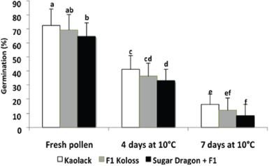 The freshly harvested pollens were filled in vials in triplicates and, respectively, stored at 10°C and −20°C. In vitro germination assessment of pollen was conducted after 4 and 7 days.