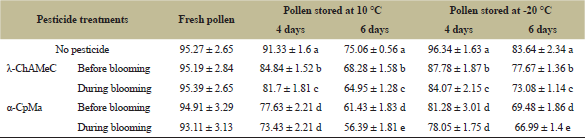 As per the effect of pesticide applications, the viability of fresh pollen collected on the flowers of watermelon treated with α-CpMa and λ-ChAMeC before and during blooming was not significantly affected (Table 1). But, pollen collected from plants treated with α-CpMa showed a viability decrease of 2.3%, while pollen from untreated plants showed a loss of viability of 21.21% after 7 days of storage at 10°C. Pollen viability was most affected when plants were treated with α-CpMa during blooming and pollen were stored during 7 days at 10°C; having a significant loss of 40.27% when compared with untreated fresh pollen.