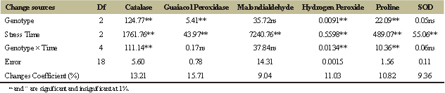 After applying the stress, the enzymes in the leaves of the studied genotypes were measured in both stress and lack of stress conditions. Each stress was extracted and measured based on the related instructions. Oxidative catalase [15], SOD [16], peroxidase [17], hydrogen peroxide [18], malondialdehyde [19], and proline [20] were identified and measured based on the methods.