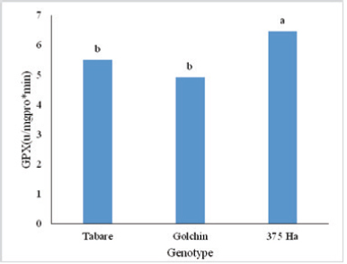 The guaiacol peroxidase mean compassion results suggested that the components of this enzyme were significantly high in tolerant genotype of 375Ha, comparing to the two sensitive (Tabare) and semi-sensitive (Golchin) genotypes. (Fig. 2) In rice also, this enzyme rate was reported to be different between tolerant and sensitive cultivars [24]. Peroxidase plays a significant role in the tolerance of stresses in Organic Plants and they are widespread in Organic Plants. In the meanwhile, guaiacol peroxidase is an important peroxidase that is known as one of the oxidizing enzymes of phenol compounds and plays an important role in inhibiting free oxygen radicals [24].