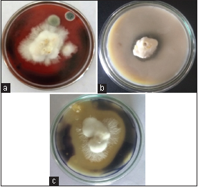 From these results, the presence of protease activity was determined using mercuric chloride solution. The clear zone around the mushroom mycelia was indicates the protease activity of P. florida [Figure 1a]. The activity of cellulase enzyme from P. florida was analyzed by Congo red aqueous solution. The appearance of yellow areas around the mycelia indicates the presence of cellulase activity [Figure 1b]. The iodine solution was used to detect the amylase enzyme activity from P. florida. Clear zone around the mushroom mycelia indicates the presence of amylase activity [Figure 1c].