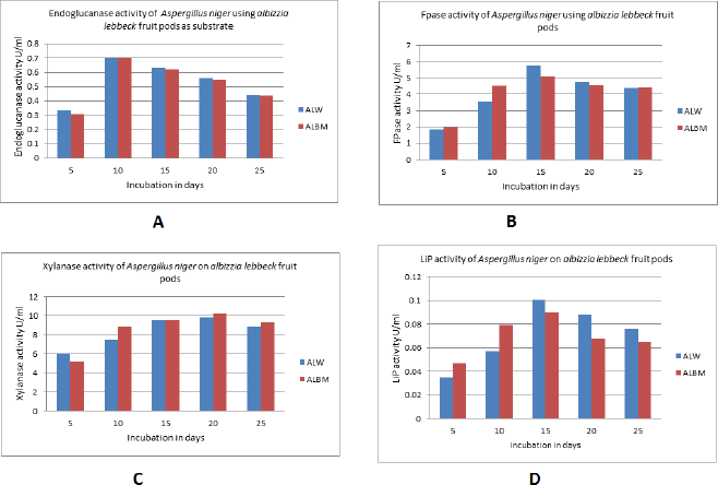 Aspergillus niger was studied for its potential to produce lignocellulolytic enzymes such as LiP, endoglucanase, FPase, and xylanase. LiP breaks down lignin, whereas endoglucanase and FPase are involved in the hydrolysis of cellulose and xylanase in hemicellulose degradation. A time course study of SSF of A. lebbeck fruit powder (ALW and ALB in duplicates) was carried out for 25 days and analyzed for the enzymes at an interval of 5 days.