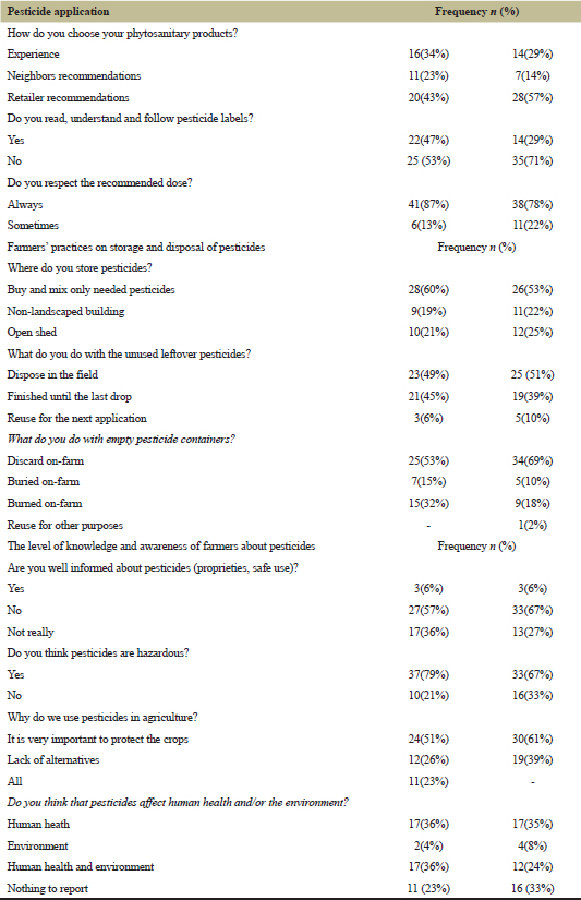 Knowledge of farmers and their perception about pesticide use and its risks on both human health and environment are shown in Table 1. According to this survey, 57% and 67 % of farmers located in Ain Naga and Doucen, respectively, are not well informed about human health and environmental risks of pesticide use. In concordance, to Belhadi et al. [4] and Boukhalfa et al. [55], the majority of them thought that these products are not dangerous. Only a few of them (two respondents in Ain Naga and four in Doucen) believed that these products might harm the environment, but contrary to the expectations, this did not significantly change their practices or attitudes toward safe pesticide use. Regarding the use of pesticides, farmers frequently follow unsafe habits. It may be owing to their insufficient level of instruction and their weak comprehension of the secure application of pesticides as noted by Jallow et al. [51] and Mubushar et al. [56]. Besides, farmers highly pay attention to incomes from their crops instead of their own health or environment [57]. Considering the purpose of use, more than 50% of farmers interviewed on both the areas to find pesticides indispensable to prevent or control pests and diseases to eliminate or reduce the yield losses and maintain the high product quality.